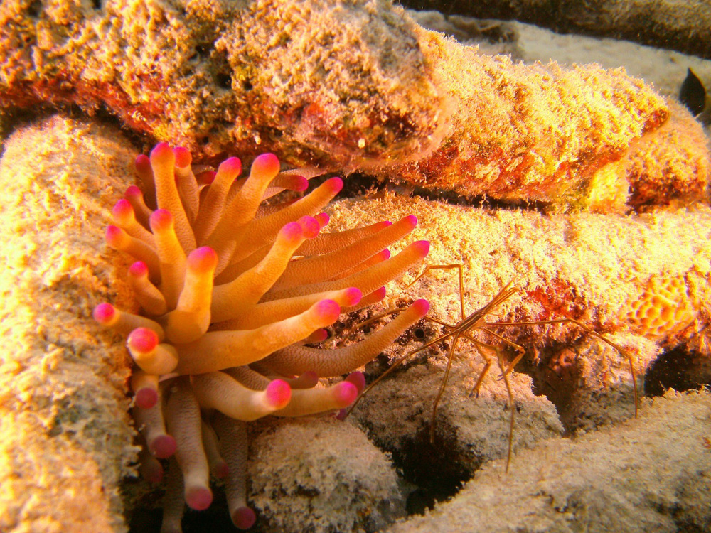 - Anemone, barracuda, red coral shrimp, shrimp, yellowhead jawfish, yellow goatfish, frogfish, crab, common octopus, purple tube sponge , peacock flounder, red mouthed goby, blenny, spiny lobster or langouste or rock lobster, vase sponge