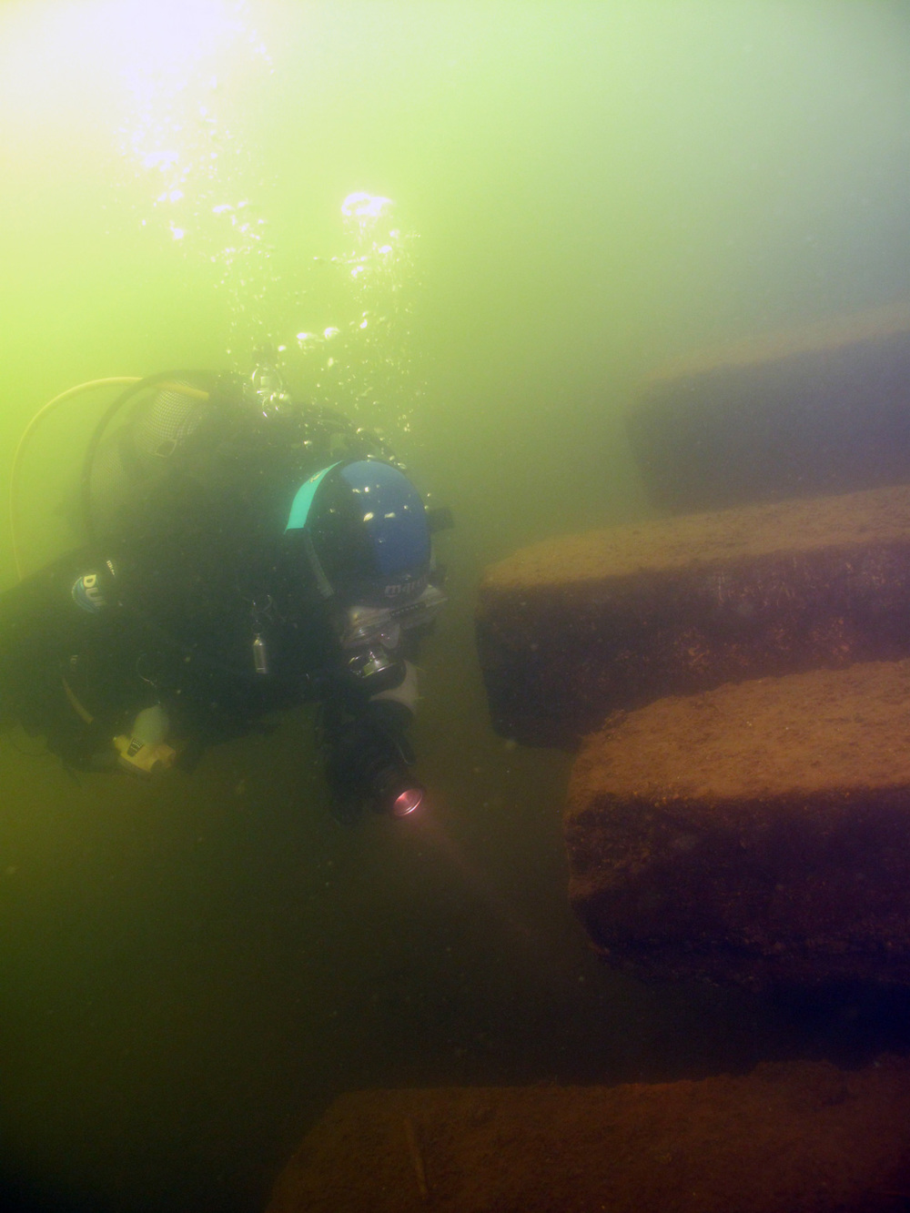 Enter the water from the stairs on the wooden quay. Check the pile of stakes, its a habitat for eels and schools of small fish.