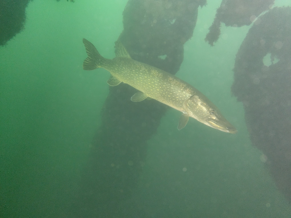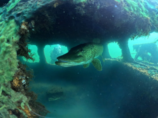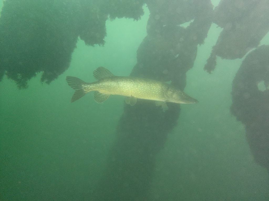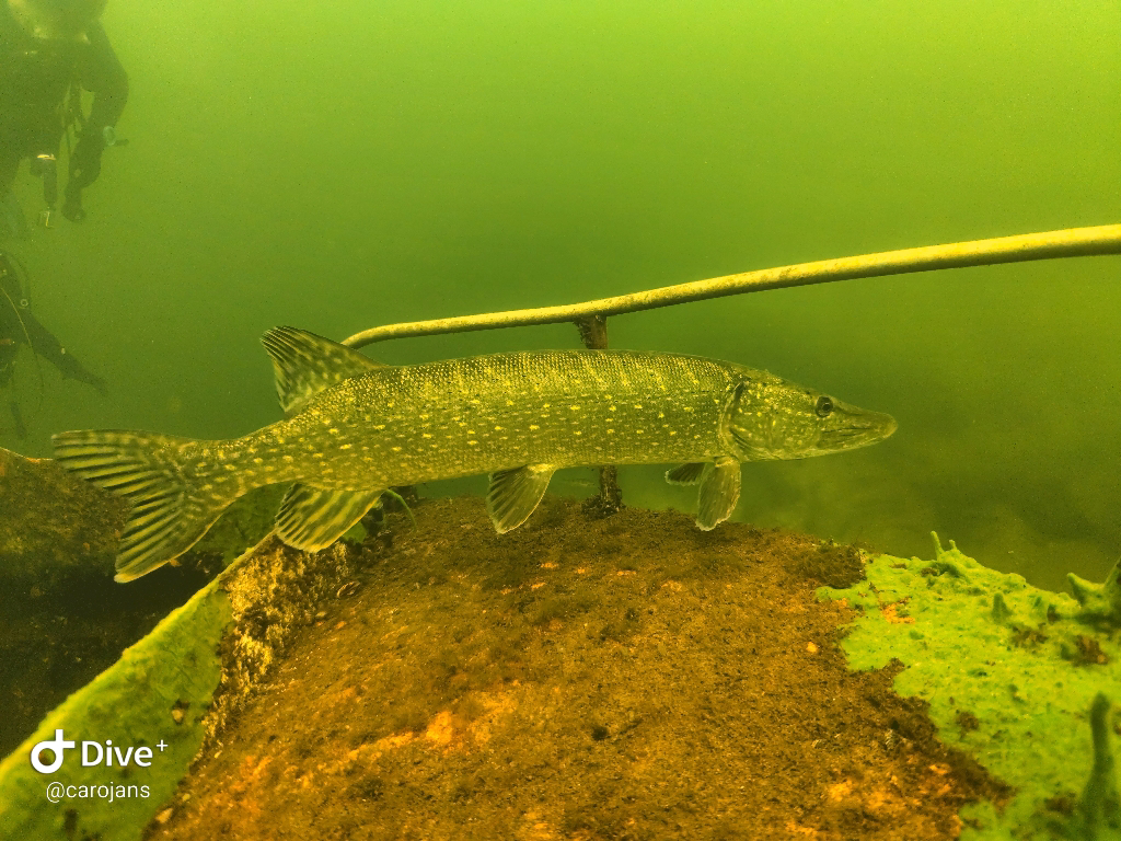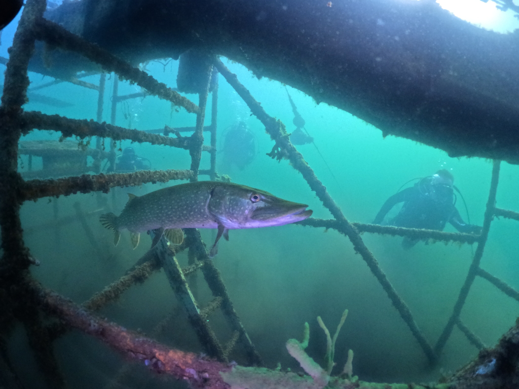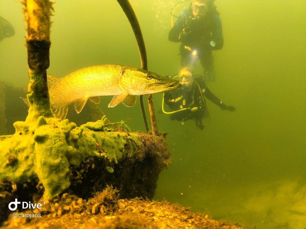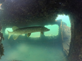 Enter the water from the jetty. Pike-perches with hatch can be spotted in spring, in the first bus close to the stairs or at the underwater house. Many pikes-perches are relatively tame.