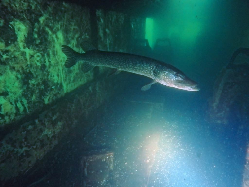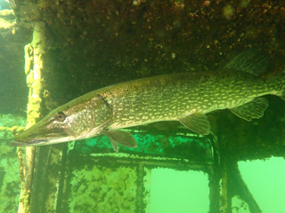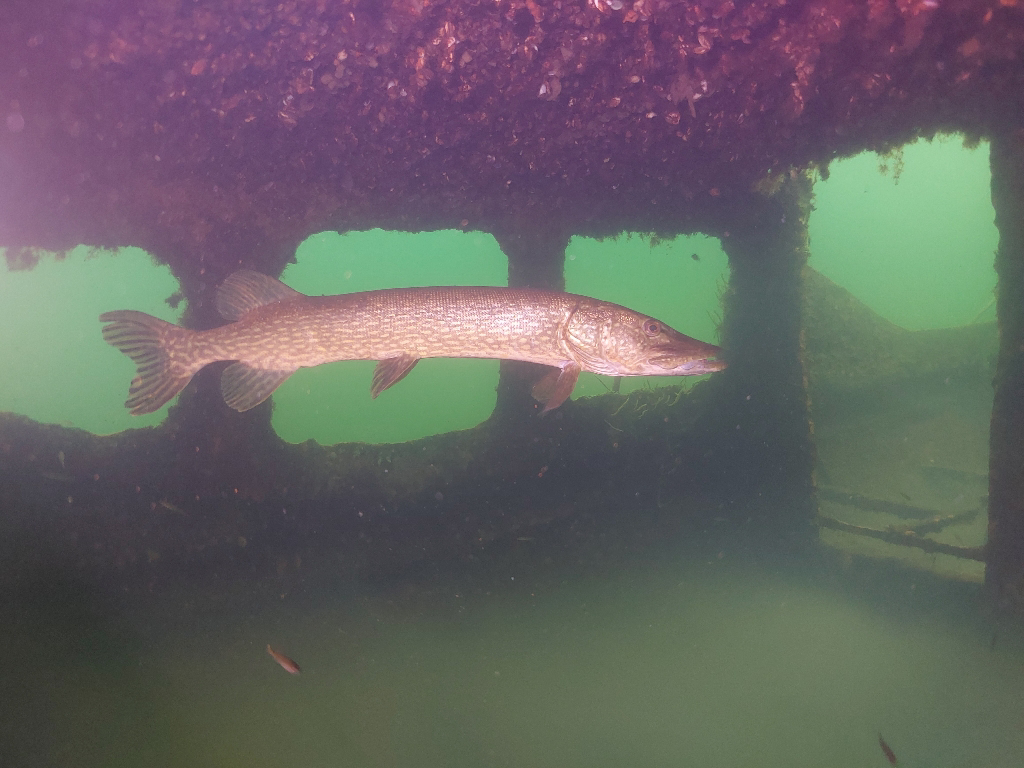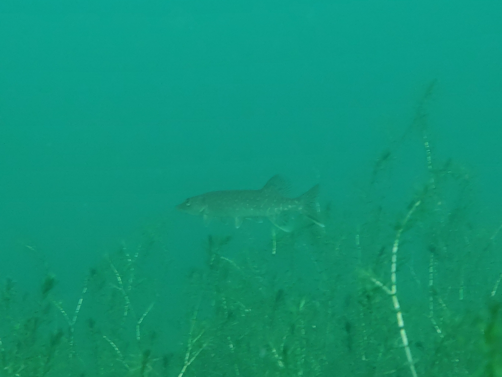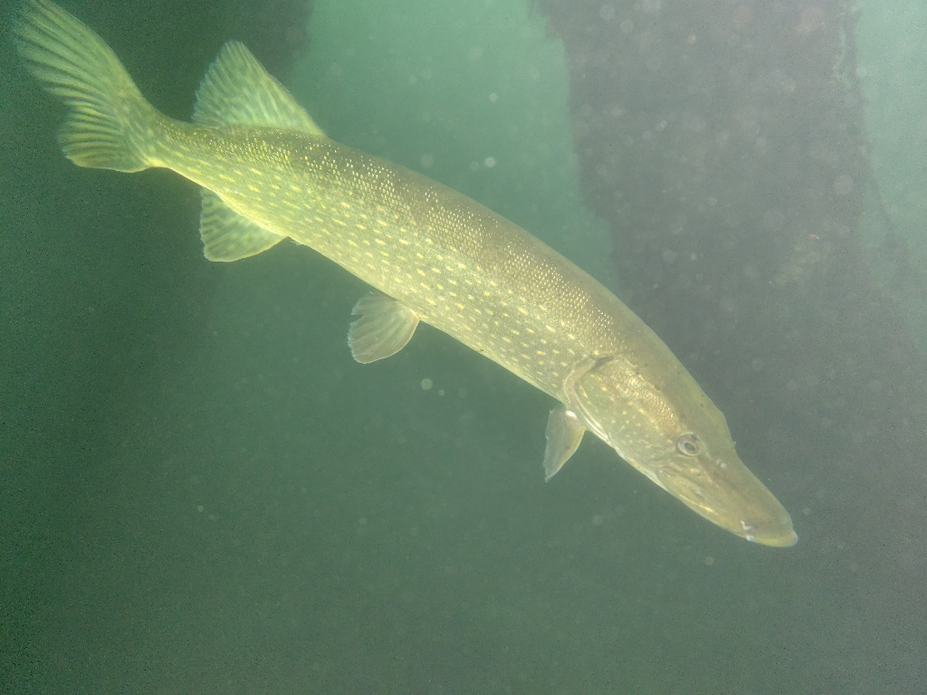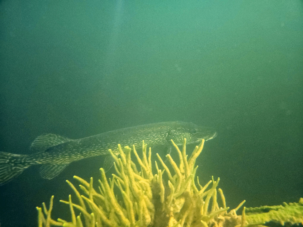 Enter the water from the jetty. Pike-perches with hatch can be spotted in spring, in the first bus close to the stairs or at the underwater house. Many pikes-perches are relatively tame.