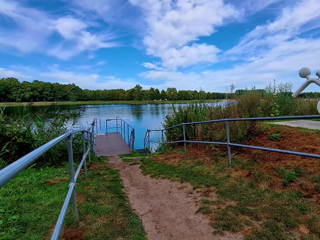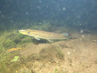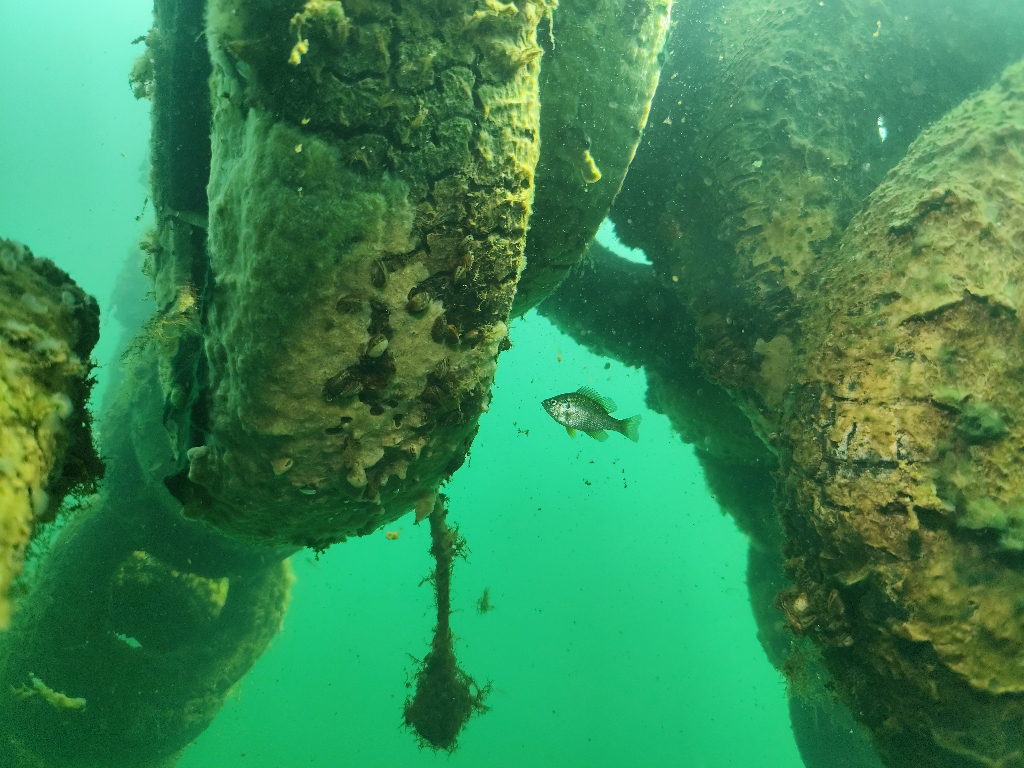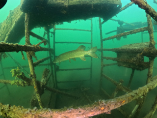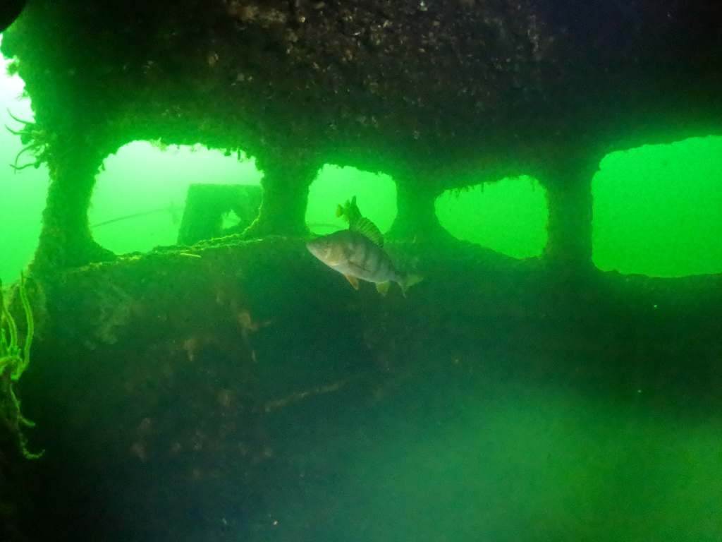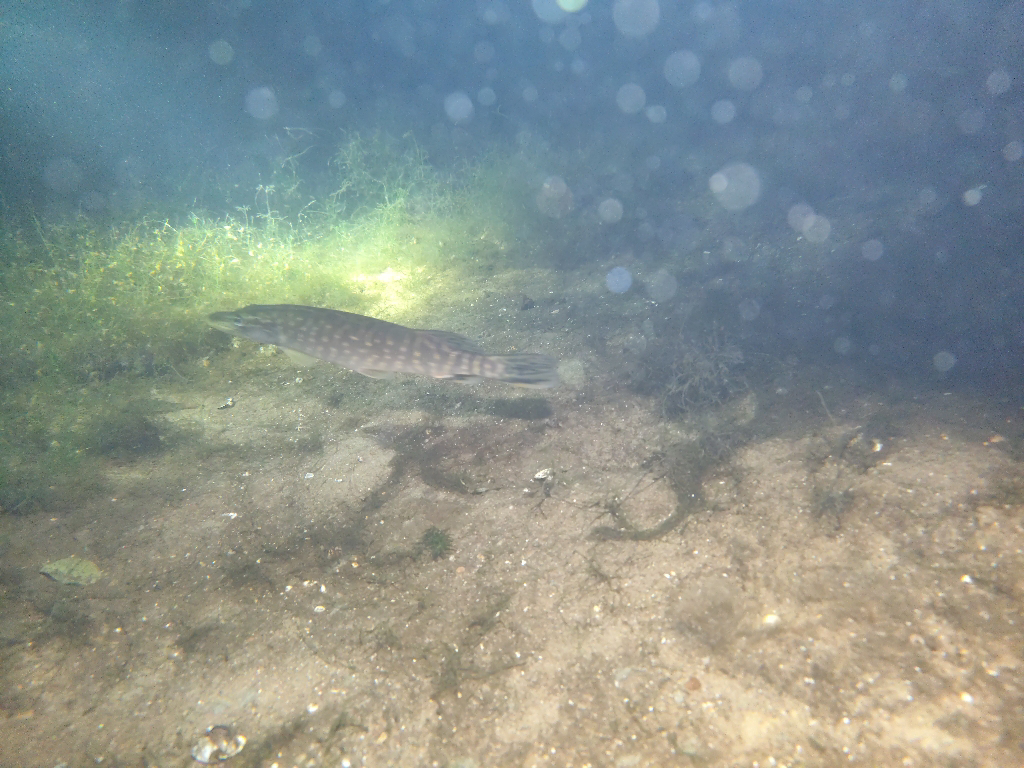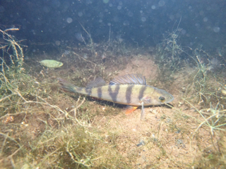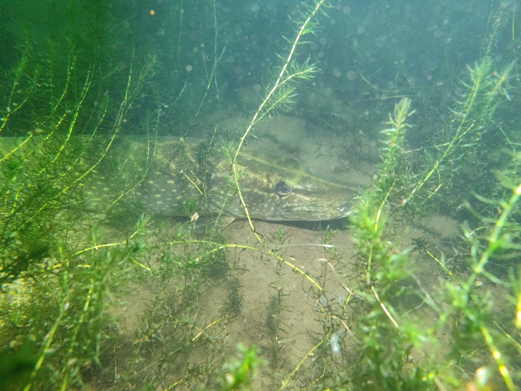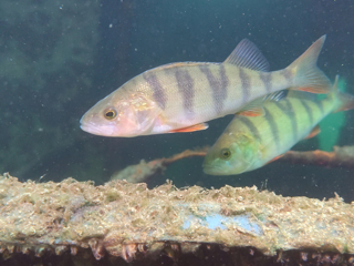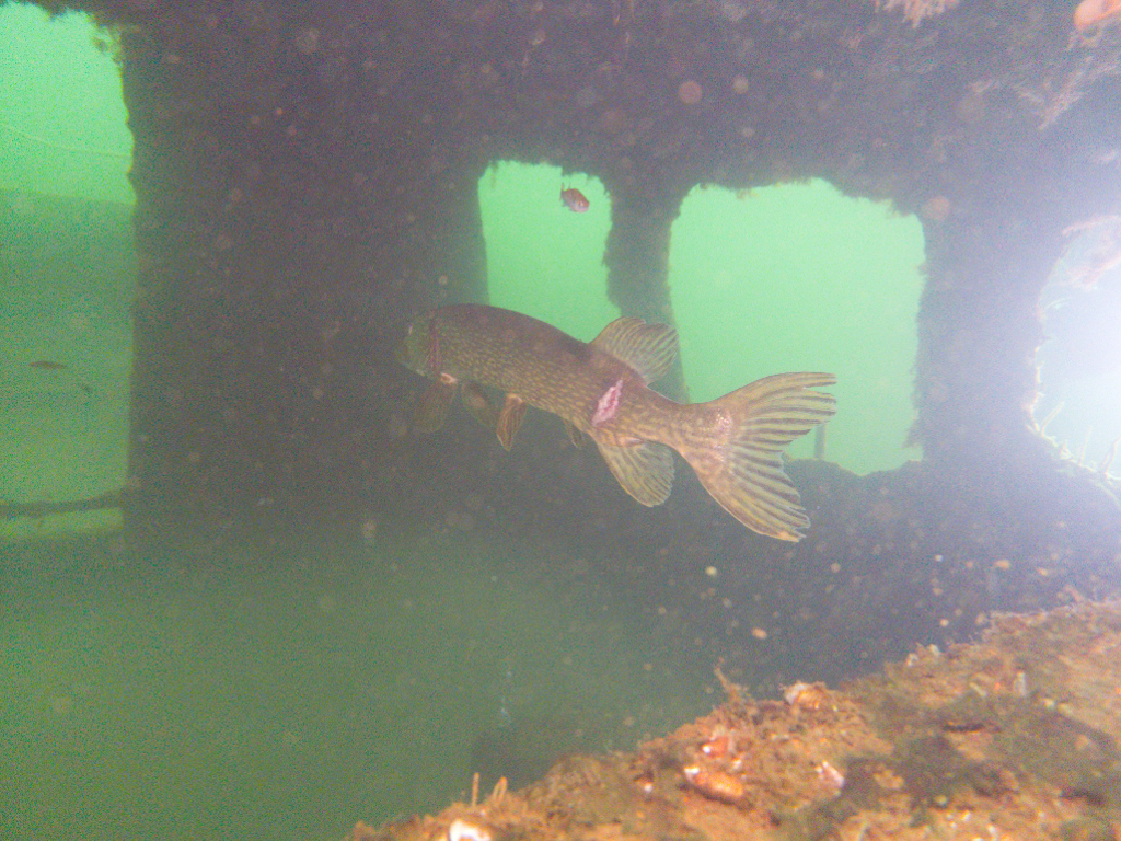 Enter the water from the jetty. Pike-perches with hatch can be spotted in spring, in the first bus close to the stairs or at the underwater house. Many pikes-perches are relatively tame.