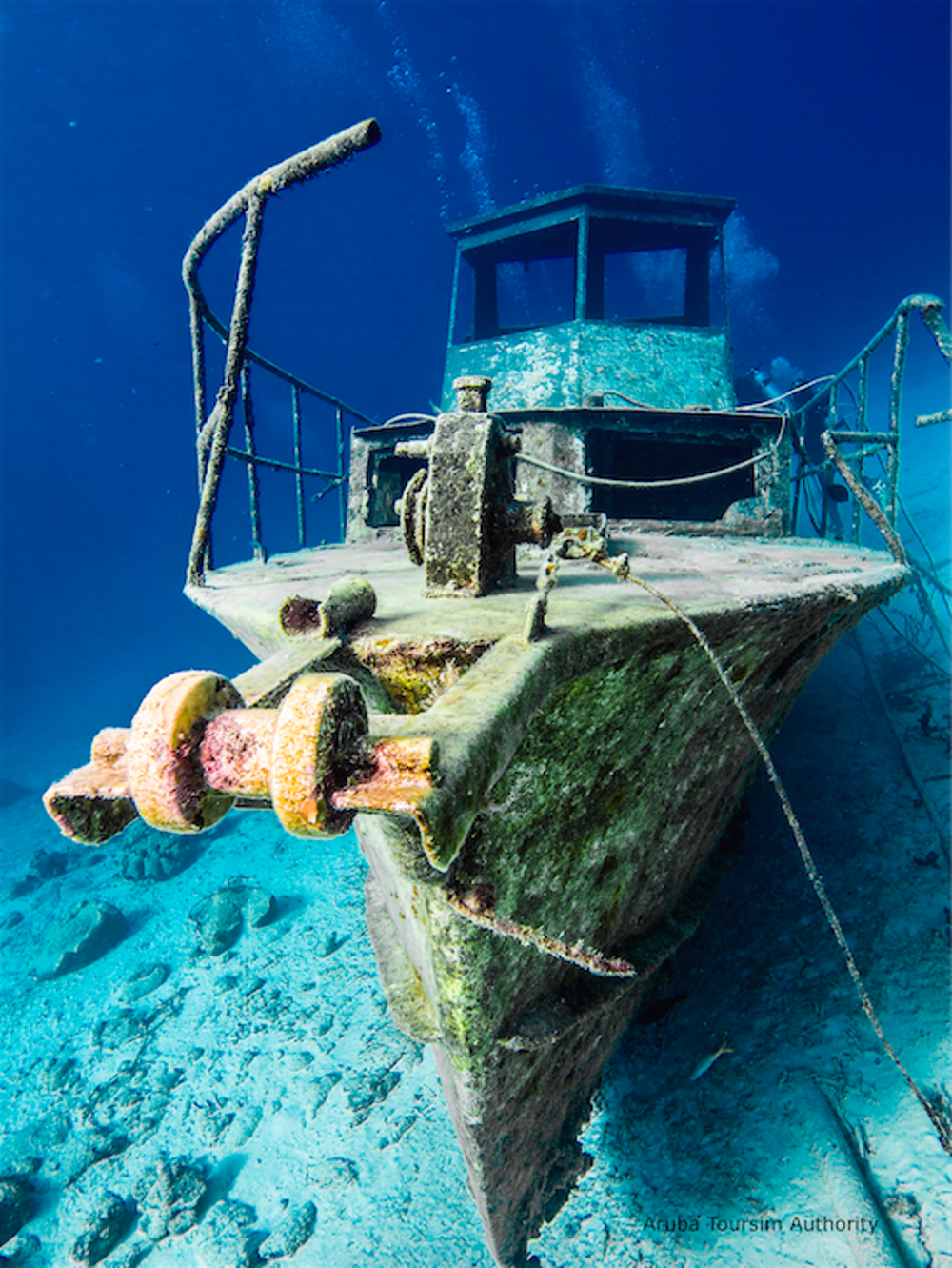 Mangel Halto, Tugboat is an excellent dive spot to start your diving adventure on Aruba. It's a bowl-shaped dive site with the wreck of an old tugboat at a depth of 12 meters. Although the water may look a bit rough on the surface in the shallow area, circumstances underwater are usually wonderfully quiet. Mangel Halto is located behind the coastal reef of Aruba where there is no current of significance. After a dive in the bowl you can make a second dive outside the coastal reef.