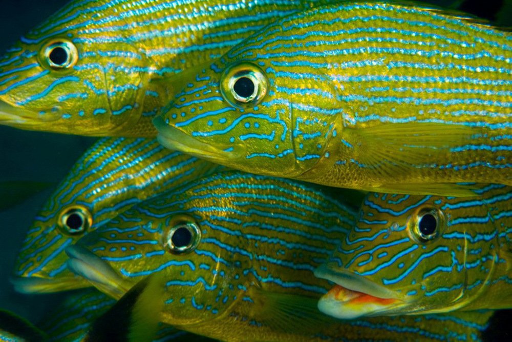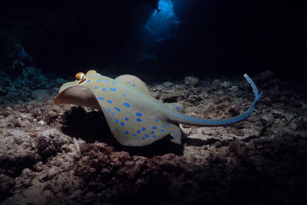 - Green moray, bannerfish, barracuda, manta ray, moray, turtle, tuna, butterfly fish (eastside), whitetip reef shark (west side) sweetlips