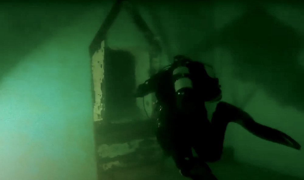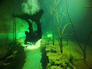 At Nullzeit you dive in a former underground drinking water reservoir in the German Ruhr area. The covered, concrete reservoir is divided into 8 theme halls, including a cave system, a silver mine, a church and a cemetery. Paid diving.