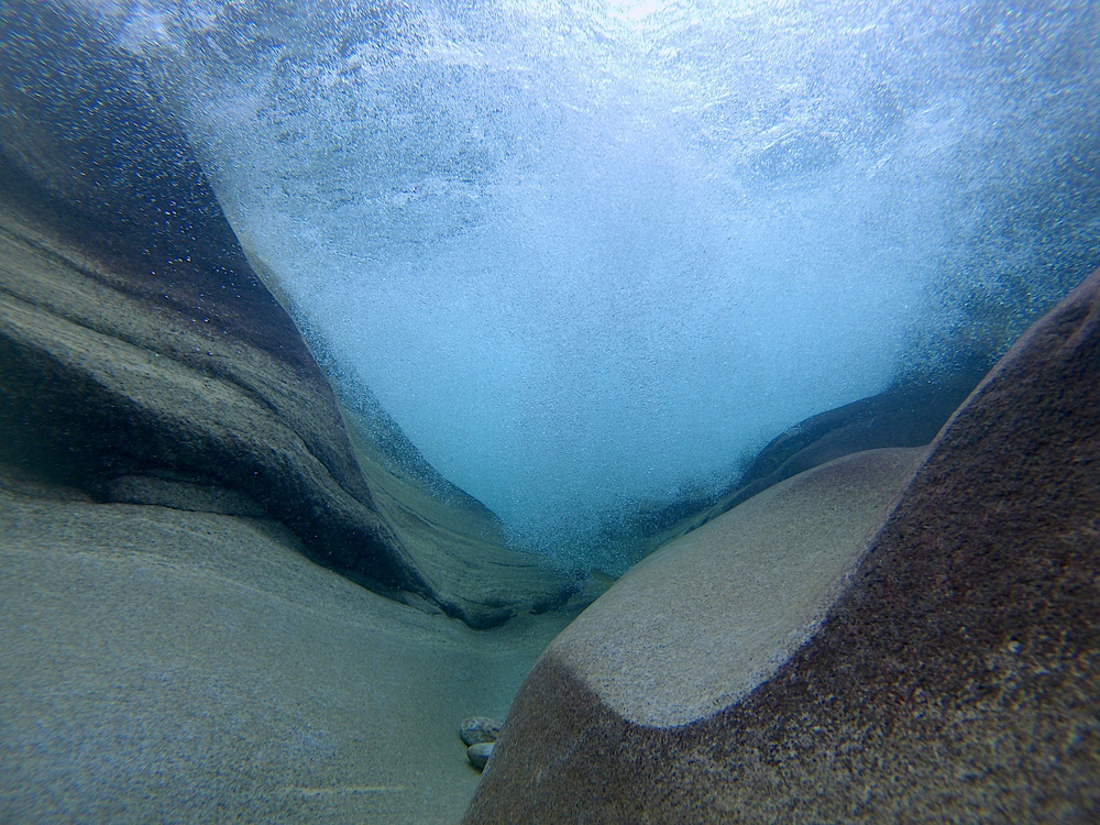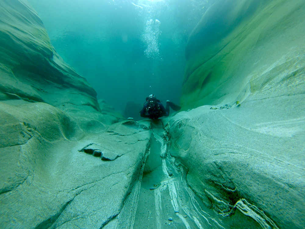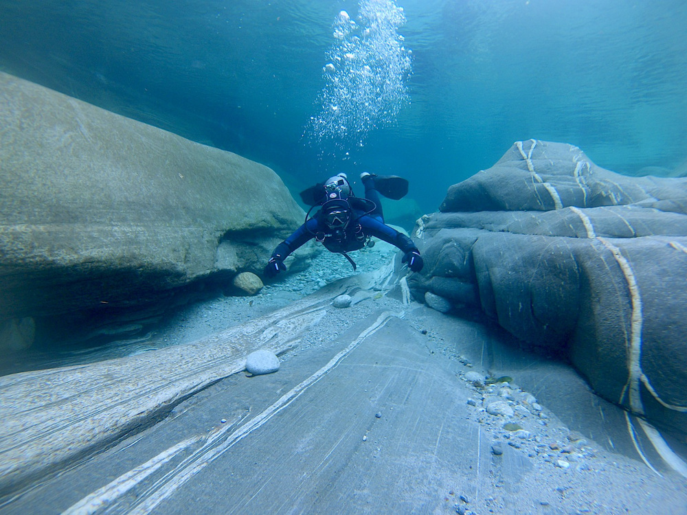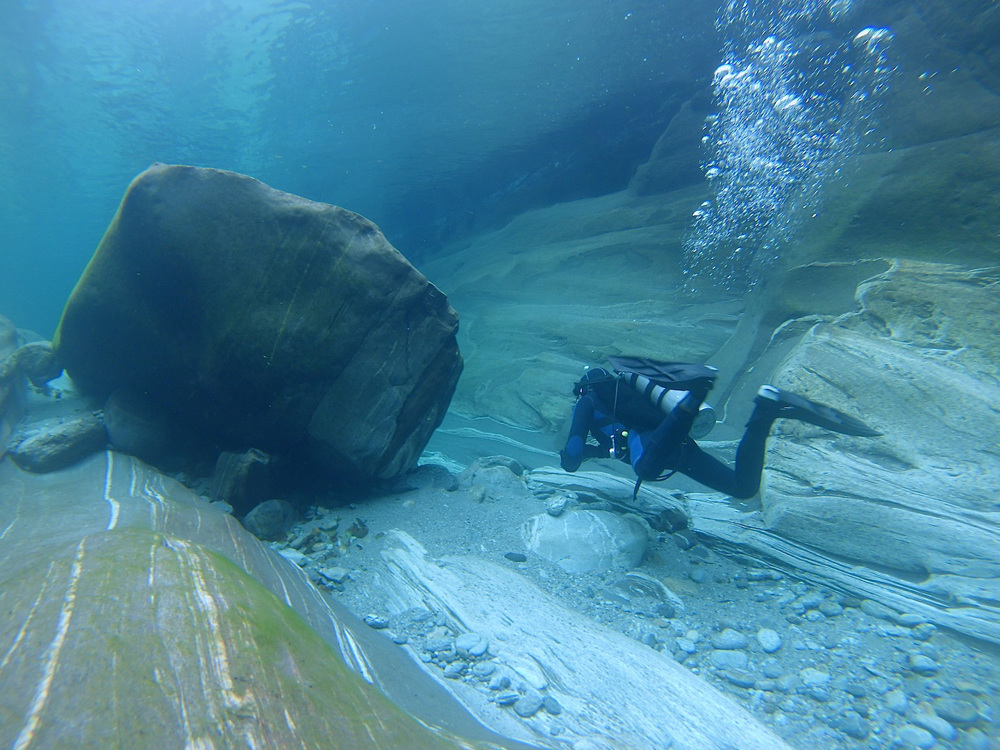 Ponte dei Salti is a special dive site in the Verzasca Valley in the Swiss canton of Ticino. Dive into the crystal clear waters of the Verzasca River in a surrealistic landscape of eroded rocks and gorges. You'll see unreal rock structures and at some times you'll find yourself diving under a waterfall. There is not much fish except for a single trout. The name Ponte dei Salti is derived from the nearby bridge. The surroundings are beautiful, it is one of the most photogenic places in Switzerland. Diving is only possible from mid-July to mid-September.