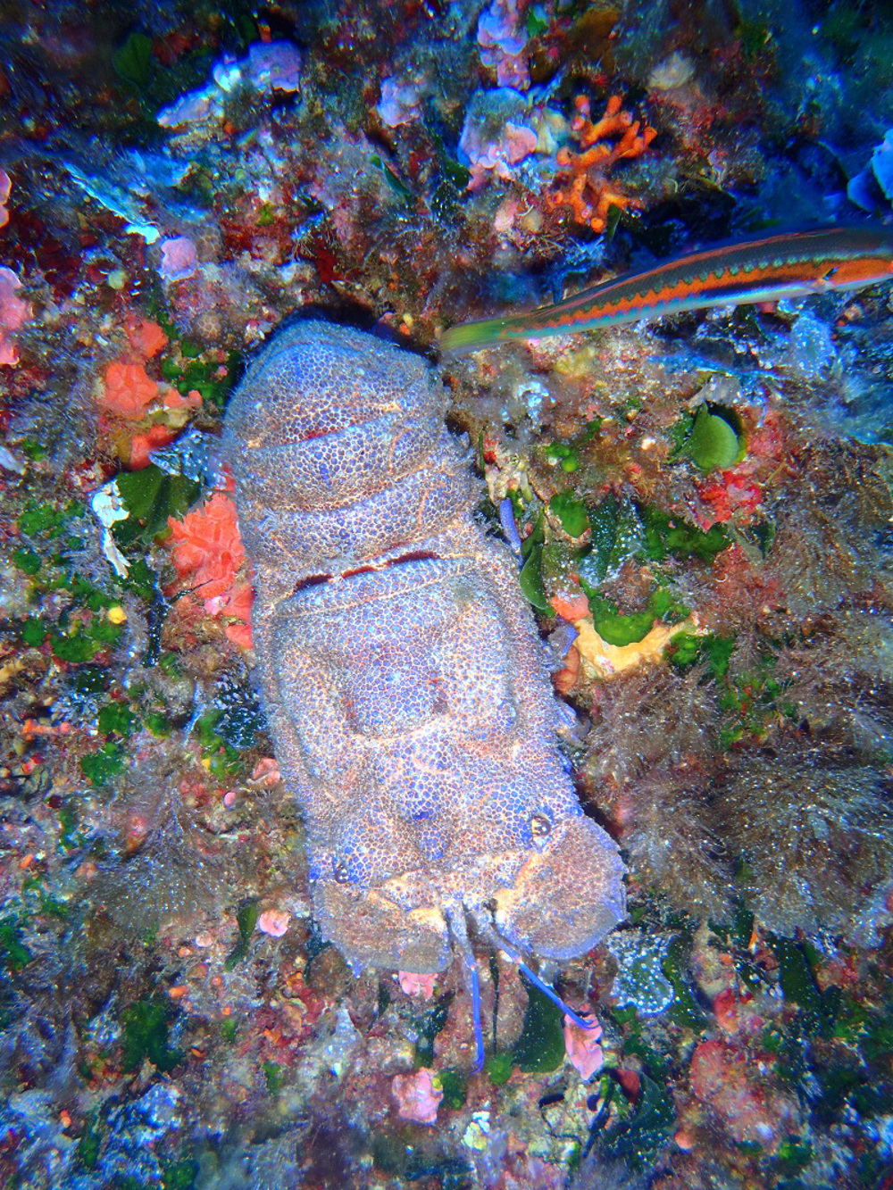 - Eagle ray, blue dotted stingray, grouper, lobster, spiny lobster or langouste or rock lobster, nudibranch, mediterranean damselfish, bogue or boops boops, dentex
