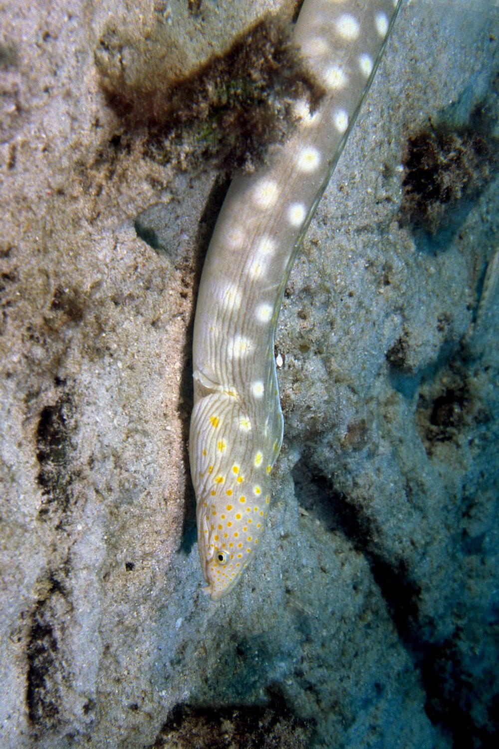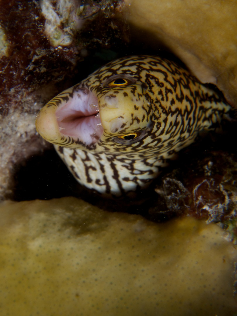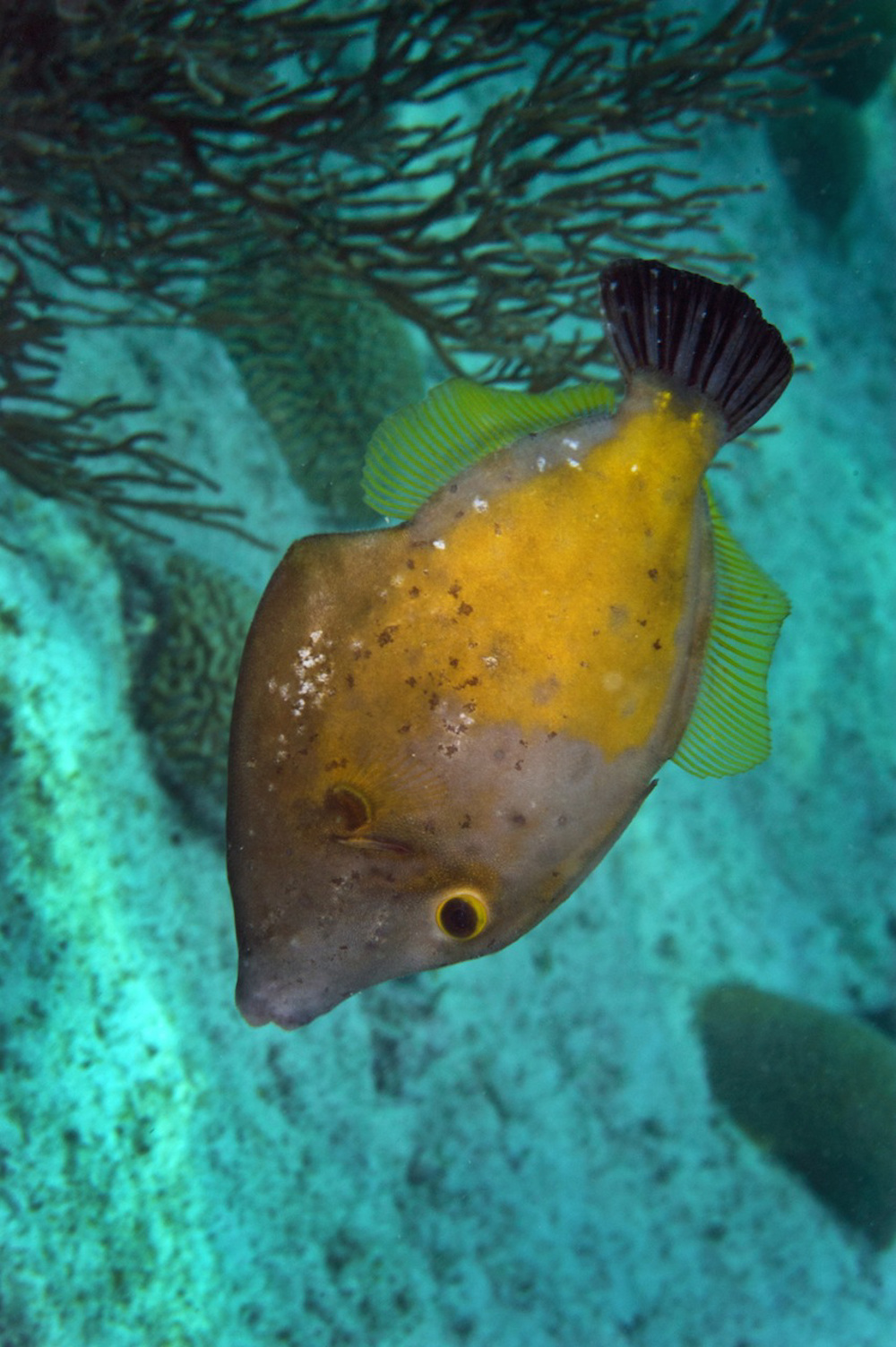 - Green moray, shrimp, goby, hard and soft coral , grey triggerfish, blenny, various kind of reef fish
