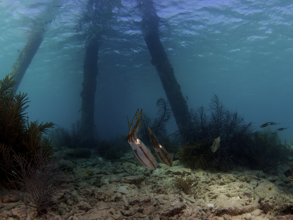 Enter the water from the shore. The pier attracts many species of fish. They’re lurking beneath the platforms. Pelicans are frequent visitors of Salt Pier. You'll spot them both above and under water. Finish your dive on the way back in the shallows, where you'll often see turtles feasting on the short, brown sea grass.
